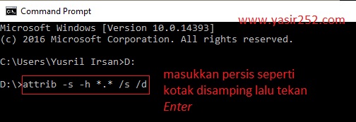 - Lalu ketik attrib -s -h *.* /s /d lalu tekan Enter. Lebih jelasnya lihat gambar