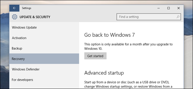 Jika kalian merasa menyesal setelah install ulang atau update windows di pc. Kalian bisa mendowngrade atau revert back ke Windows lama kalian. Caranya juga gak susah, kalian langsung aja pergi ke Settings > Update & Security > Recovery. Nanti disitu, kalian akan lihat tombol “Get Started” dibawah “Go back to Windows 7″ atau “Go Back to Windows 8.x”, hal ini bergantung pada versi windows lama sebelum windows versi baru diinstall.