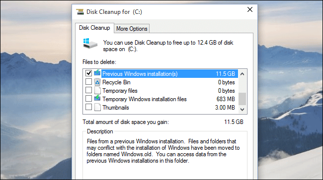 Nah di sini, akan keliatan ada Previous Windows Installation atau Folder Windows.old yang memakan banyak sekali space pada harddisk. Seperti digambar besarnya mencapai hampir 12GB. Maka dengan disk cleanup inilah baru kalian bisaa menghapusnya.