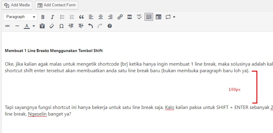 Tapi sayangnya fungsi shortcut ini hanya bekerja untuk satu line break saja. Kalo kalian paksa untuk SHIFT + ENTER sebanyak 2x atau lebih. Tetap saja wordpress akan menganggap itu sebagai satu line break. Ngeselin banget ya?